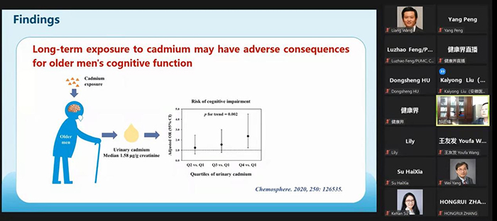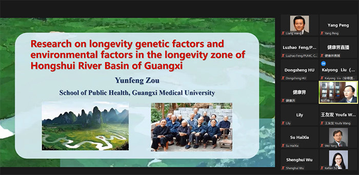 邹云锋教授做了大会主题报告“Research on longevity genetic factors and environmental factors in the longevity zone of Hongshui River Basin of Guangxi 广西红水河流域长寿遗传因素与环境因素研究”,主要内容包括红水河流域长寿带、红水河流域健康老年人队列、红水河流域长寿与遗传因素、环境因素的关系研究的进展等,并重点报告了张志勇教授团队近年来利用红水河流域健康老年人队列开展的长寿环境遗传因素研究的相关成果,与会专家围绕相关问题进行了热烈讨论。