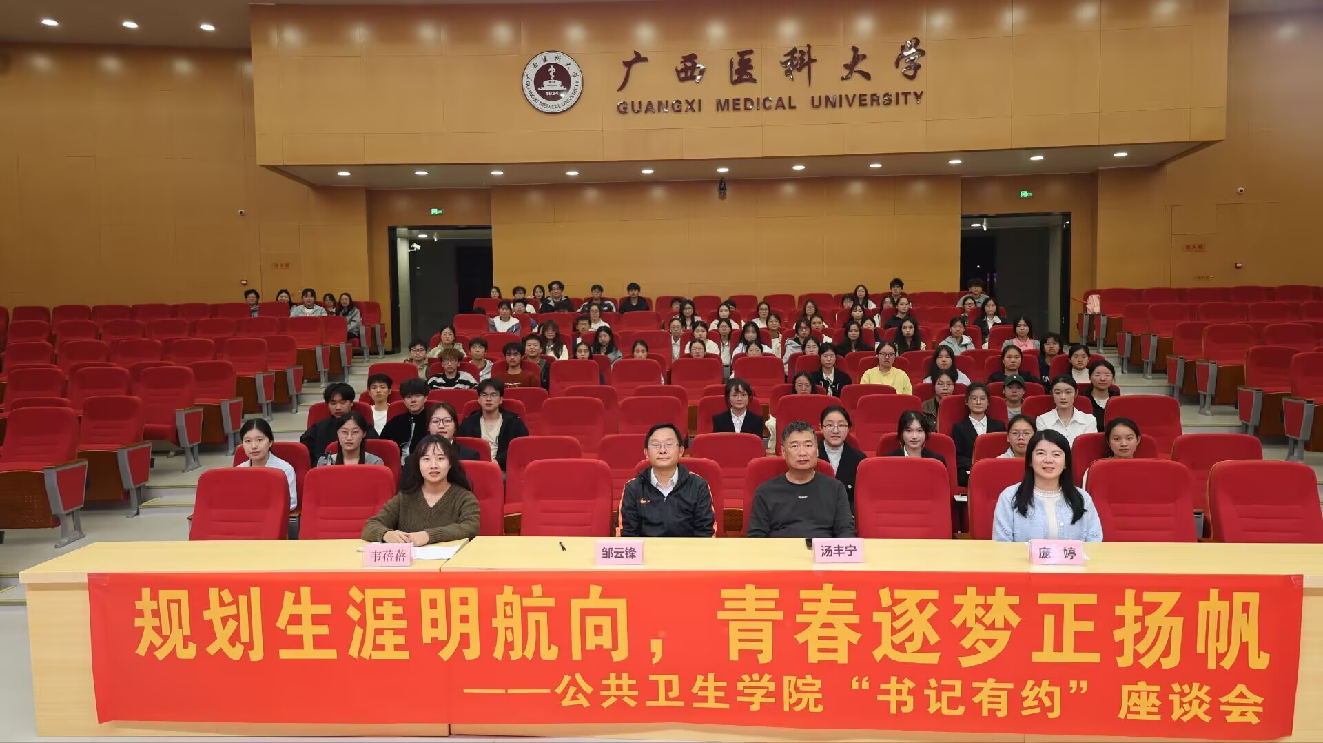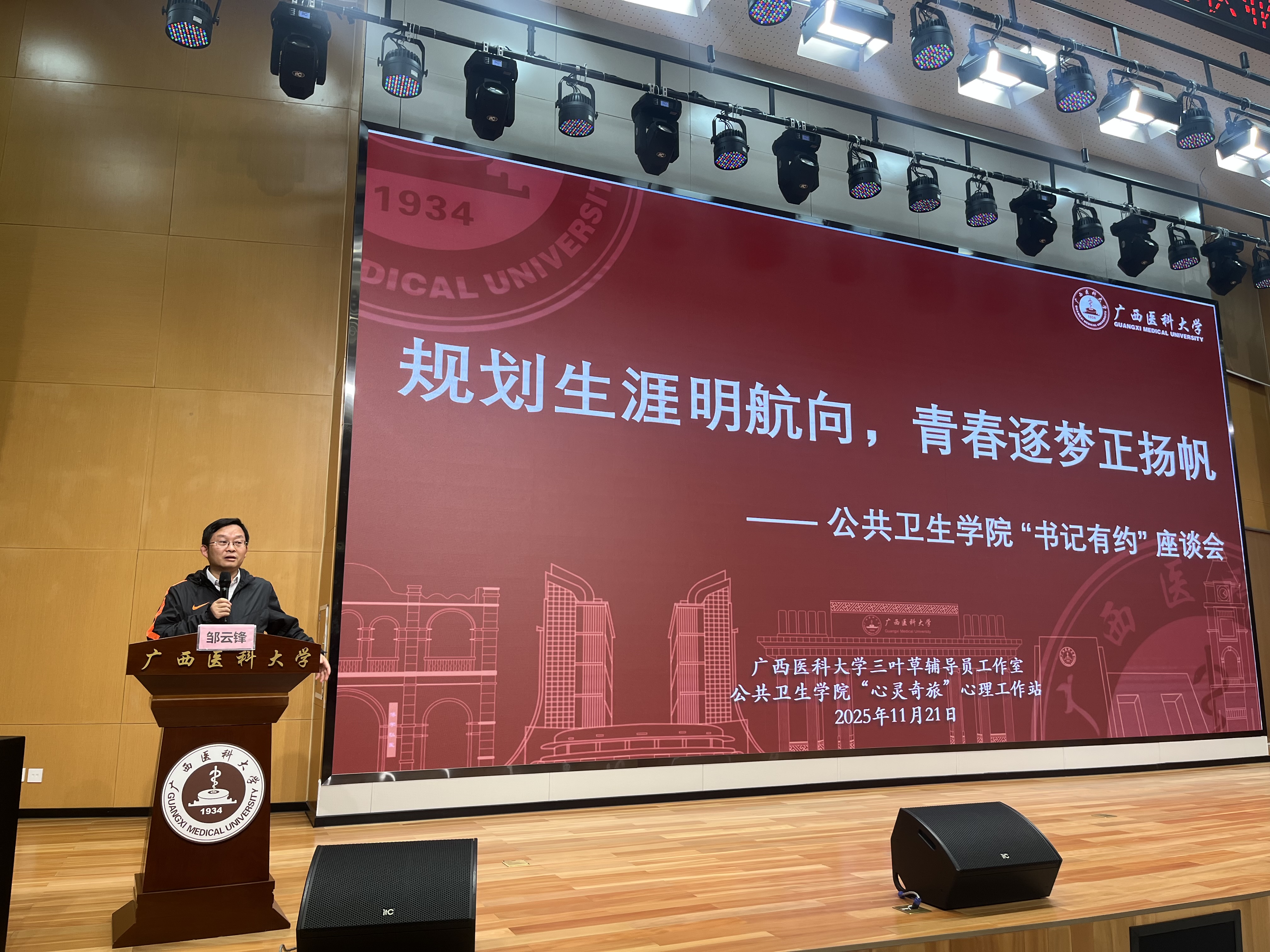 当前位置:要闻动态为帮助低年级学生明确学业方向、筑牢成长根基,科学规划大学生涯与未来发展。11月21日,公共卫生学院在武鸣图书馆鼎新报告厅开展了以“规划生涯明航向,青春逐梦正扬帆”为主题的“书记有约”座谈会。学院党委书记邹云锋,学工办主任汤丰宁、辅导员庞婷和韦蓓蓓以及大一大二学生代表参加了本次座谈会。